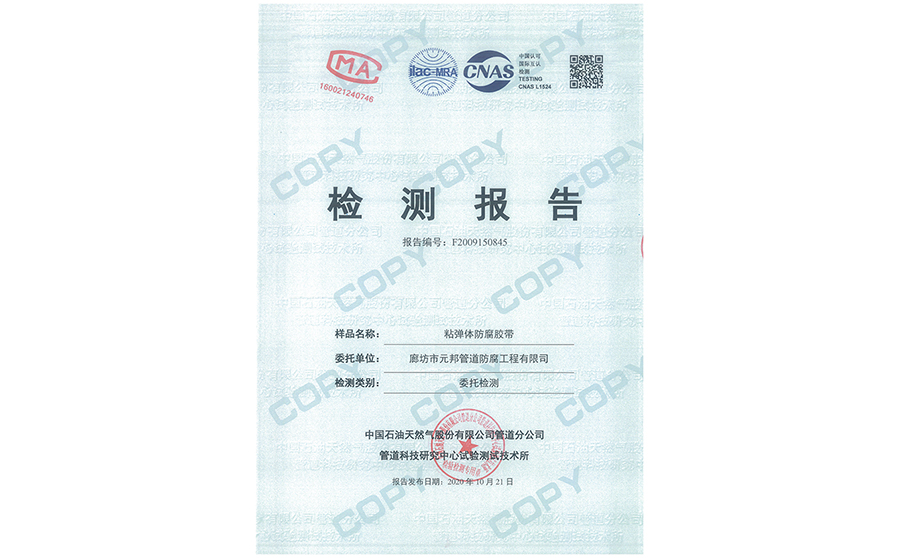 全民塑膠生產(chǎn)的粘彈體膠帶、粘彈體防腐膏等防腐材料,有廊坊市元邦管道防腐工程有限公司現(xiàn)場(chǎng)抽樣送檢,由國(guó)家認(rèn)可實(shí)驗(yàn)室依據(jù)CDP-S-OGP-AC-017-2013-2油氣管道工程粘彈體防腐材料技術(shù)規(guī)格書,對(duì)檢測(cè)項(xiàng)目、技術(shù)指標(biāo)和試驗(yàn)方法要求完全符合。